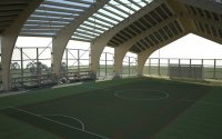 Terenul de sport multifuncțional, respectiv mini fotbal și tenis de câmp, a fost construit pentru îmbunătățirea activității de agrement. De asemenea, terenul multifuncțional va fi acoperit cu o copertină formată din poliplan și un luminator, poziționat în partea centrală a terenului, din policarbonat, pentru a oferi necesarul de lumină pentru practicarea sporturilor sau diverselor activități ce se vor presta. La baza acestei copertine va exista o structură din lemn stratificat pe fundații din beton armat. Pardoseala va fi din gazon artificial, pe șapă de nivelare. Gazonul artificial este de o calitate deosebită și are înălțimea de 50 mm.